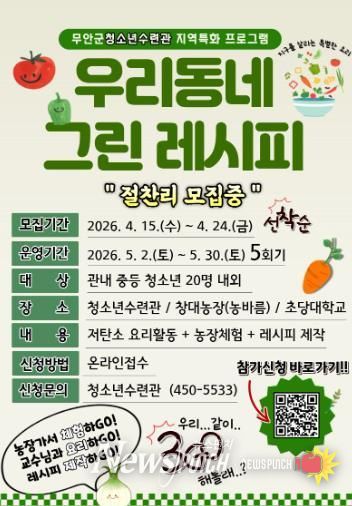 무안군청소년수련관은 ‘우리동네 그린레시피’ 프로그램 참가자를 오는 4월 24일까지 모집한다고 밝혔다.