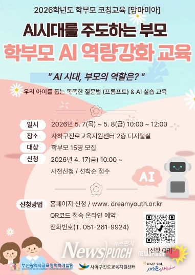 뉴스펀치 김윤걸 기자 | 사하구진로교육지원센터는 오는 5월 7일부터 5월 8일까지 양일간 학부모를 대상으로 'AI 시대, 부모의 역할은?' 특강을 운영한다.