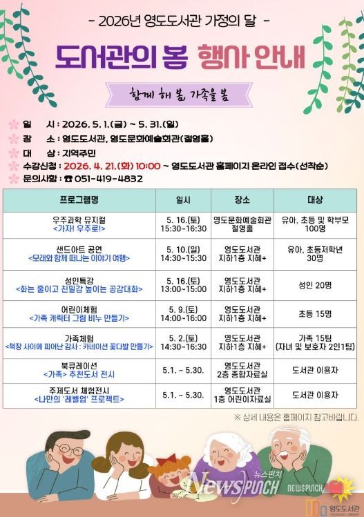 뉴스펀치 김윤걸 기자 | 영도구 영도도서관은 오는 5월 1일부터 31일까지 가정의 달을 맞아 온 가족이 함께 즐길 수 있는 '도서관의 봄' 행사를 개최한다고 밝혔다.