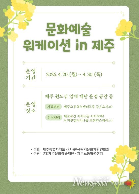 뉴스펀치 김용희 기자 | 제주특별자치도와 한국광역문화재단연합회가 주최하고 제주문화예술재단(이사장 김석윤)이 주관하는 2026년 ‘문화예술 워케이션 in 제주’ 1차 프로그램이 오는 20일부터 4월 30일까지 운영된다.