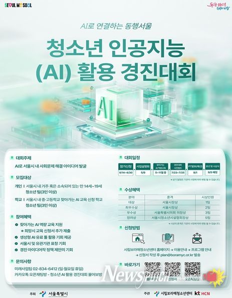 뉴스펀치 박상훈 기자 | 서울시는 청소년이 인공지능(AI)을 활용해 지역사회 문제해결 아이디어를 제안하고 이를 공공정책으로 연결하는 '2026 청소년 인공지능(AI) 활용 경진대회'를 개최하고 4월 30일까지 참가자를 모집한다.