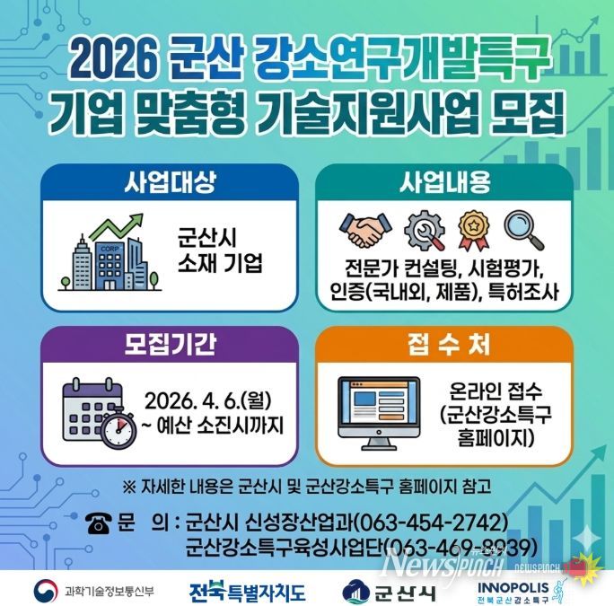 뉴스펀치 최영남 기자 | 군산시는 관내 기업의 기술 경쟁력 강화를 위해 ‘2026년 군산 강소연구개발특구 기업 성장단계별 기술지원사업’을 본격 추진한다고 밝혔다.