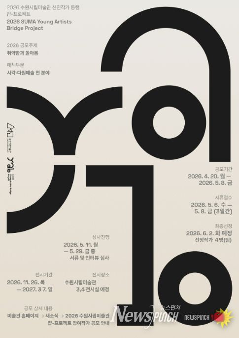 뉴스펀치 박상훈 기자 | 경기도 수원시립미술관은 신진작가 발굴 및 창작 지원을 위한 공모 사업‘신진작가 동행 얍-프로젝트(YAB-Project)’를 개최하고 4월 20일부터 5월 8일까지 참여자 모집 공고를 시작한다. 서류 접수는 5월 6일부터 5월 8일 오후 6시까지 이메일을 통해 진행된다.