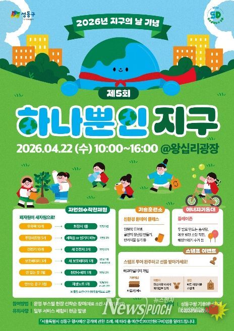 뉴스펀치 박상훈 기자 | 서울 성동구는 오는 4월 22일 왕십리광장에서 기후위기의 심각성을 알리고 탄소중립 실천 문화를 확산하기 위한 ‘제5회 하나뿐인 지구’ 행사를 개최한다고 밝혔다.