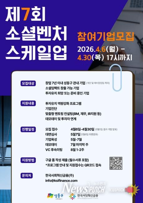 뉴스펀치 박상훈 기자 | 서울 성동구는 관내 소셜벤처기업을 대상으로 투자 유치 역량 강화를 위해 2026년 제7회 소셜벤처 스케일업 프로그램 참여기업을 모집한다고 밝혔다.