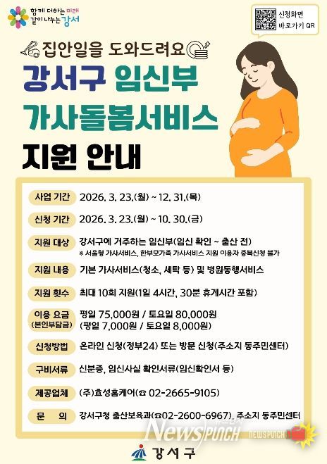 뉴스펀치 박상훈 기자 | 서울 강서구는 임신부의 가사 노동 부담을 덜고 건강한 출산을 돕기 위해 ‘임신부 가사돌봄서비스’를 확대 시행한다.