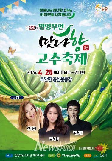 뉴스펀치 박세훈 기자 | 경남 밀양시는 오는 25일 무안면 공설운동장 일원에서 ‘제22회 밀양무안맛나향 고추 축제’를 개최한다.