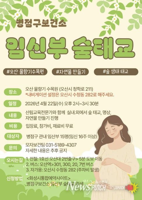 뉴스펀치 박상훈 기자 | 화성특례시 병점구보건소는 임신부의 정서적 안정과 건강한 출산을 지원하기 위해 오는 22일 ‘임신부 숲태교 프로그램’을 운영한다고 밝혔다.