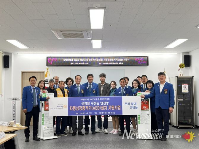 뉴스펀치 박상훈 기자 | 국제로타리 3600지구 2025-26 광주지역협의회는 지난 17일 광주시자원봉사센터 4층 교육장에서 자동심장충격기 기증식을 개최하고 500만 원 상당의 장비 2대를 전달했다.
