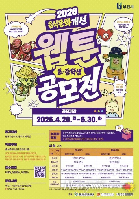 뉴스펀치 박상훈 기자 | 부천시는 4월 20일부터 6월 30일까지 ‘2026년 음식문화개선 초중학생 웹툰·캐릭터 공모전’을 연다. 이번 공모전은 학생들이 일상 속 음식문화를 주제로 직접 창작에 참여함으로써 올바른 식문화에 대한 인식을 높이기 위해 매년 추진되고 있다.