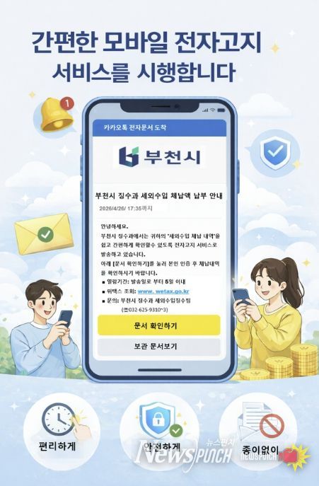 뉴스펀치 박상훈 기자 | 부천시는 이달 20일부터 시민 납세 편의를 높이고 고지서 전달의 정확성을 강화하기 위해 세외수입(일반회계) 체납안내문을 카카오톡으로 발송하는 모바일 전자고지 서비스를 시행한다.