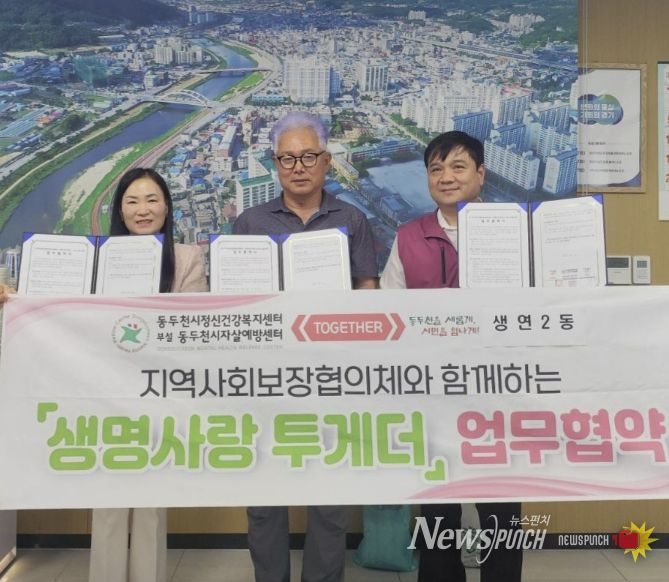 뉴스펀치 박상훈 기자 | 동두천시정신건강복지센터 부설 자살예방센터는 ‘생명사랑 투게더’사업 추진을 위해 지난 17일, 생연2동 행정복지센터 및 생연2동 지역사회보장협의체와 업무협약을 체결했다.