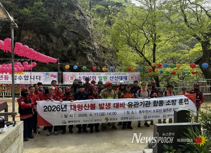 뉴스펀치 박상훈 기자 | 동두천시는 지난 17일 소요산 일주문 일대에서 대형 산불 발생에 대비한 유관기관 합동 소방훈련을 실시했다.