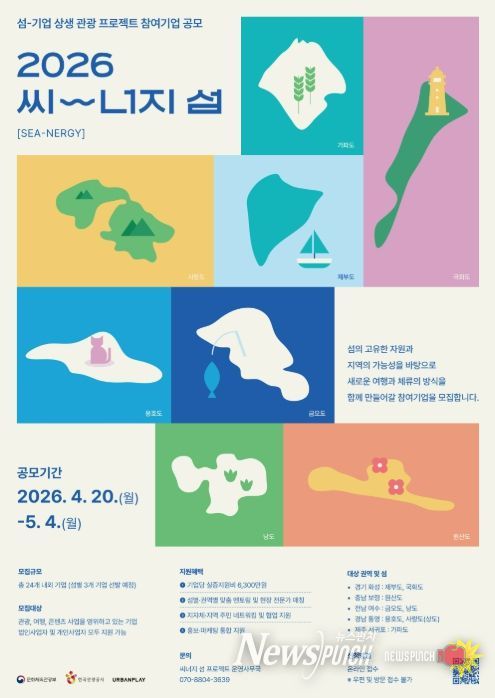 뉴스펀치 박세훈 기자 | 문화체육관광부가 주최하고 한국관광공사가 주관한 2026년 씨너지『섬-기업 상생 관광프로젝트』 참여기업 공모를 오는 4월 20일 월요일 부터 5월 4일 월요일까지 모집한다.
