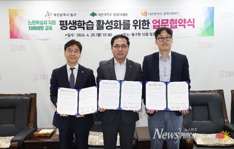 뉴스펀치 이현승 기자 | 대전 동구는 20일 대전대학교 RISE사업단‧대전시치매센터와 ‘느린학습자 평생교육 지원’과 ‘치매예방 프로그램 운영’을 위한 업무협약을 체결했다고 밝혔다.