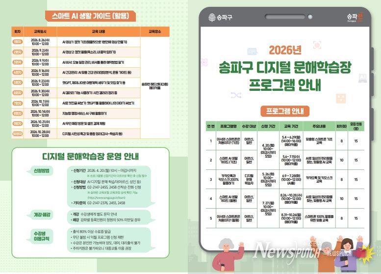 뉴스펀치 박상훈 기자 | 서울 송파구는 스마트폰과 AI 사용이 익숙하지 않은 주민을 위해 5월부터 ‘디지털 문해학습장’ 교육을 운영한다.