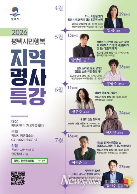 한편 모든 강좌는 4월 20일부터 평택시 평생학습 포털 및 전화로 사전 신청할 수 있으며, 일부 잔여 좌석에 한해 현장 참여도 가능하다. 평택시는 이번 지역 명사 특강을 통해 시민의 지식 성장을 지원하고, 열린 평생학습 문화 조성을 더욱 강화할 계획이다.