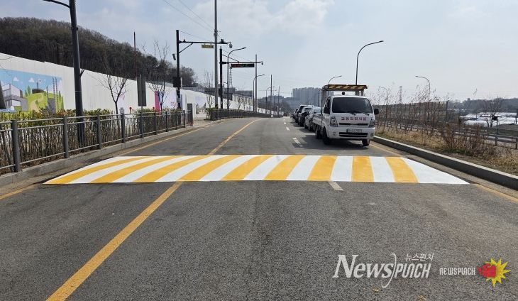 뉴스펀치 박상훈 기자 | 오산시는 가수초등학교 통학로 안전 확보를 위해 인근 우미린 레이크시티 아파트 공사장 진출입로 주변에 과속방지턱 4개소를 신설했다고 밝혔다.