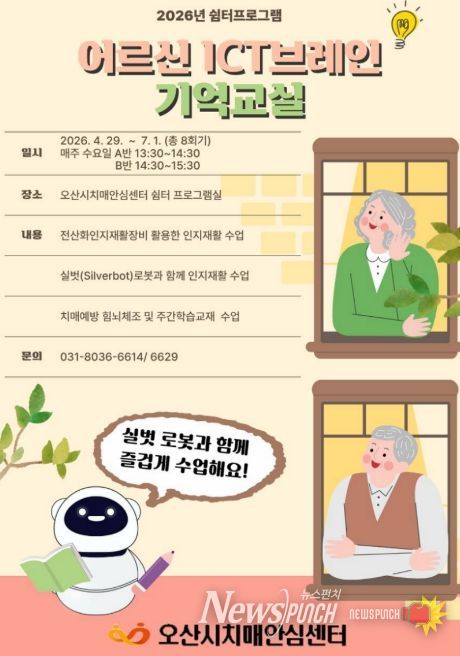 뉴스펀치 박상훈 기자 | 오산시치매안심센터는 오는 4월 29일부터 경증 치매환자를 위한 쉼터 프로그램 ‘ICT 브레인 기억 교실’을 운영한다고 밝혔다.