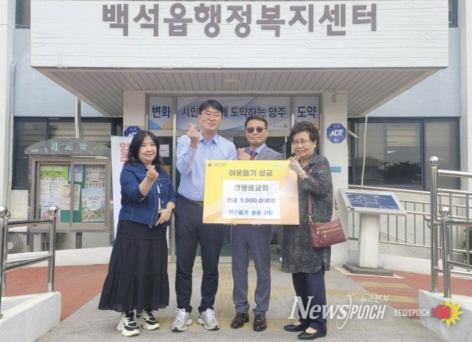 뉴스펀치 박상훈 기자 | 양주시 백석읍은 지난 17일 생명샘교회가 지역 내 어려운 이웃을 돕기 위한 성금 100만 원을 기탁했다고 밝혔다.