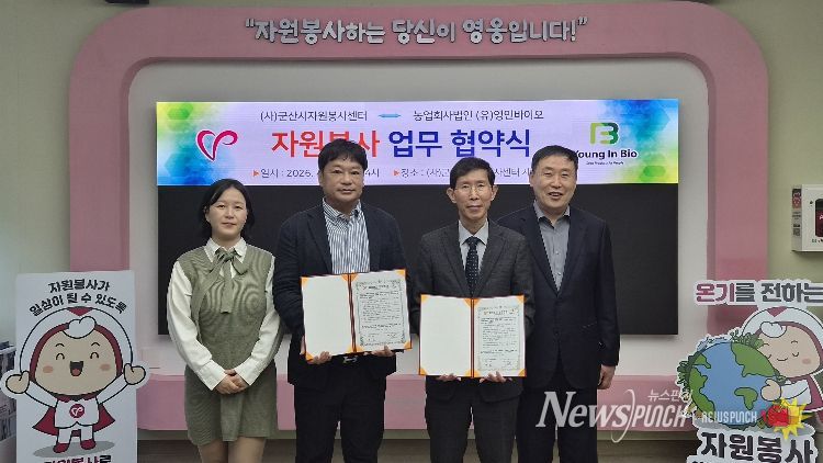 뉴스펀치 정홍균 기자 | (사)군산시자원봉사센터(이사장 황진)와 농업회사법인 (유)영인바이오(대표 최인정)는 4월 20일 오후 2시, 군산시자원봉사센터 세미나실에서 자원봉사 활성화를 위한 업무협약(MOU)을 체결했다.