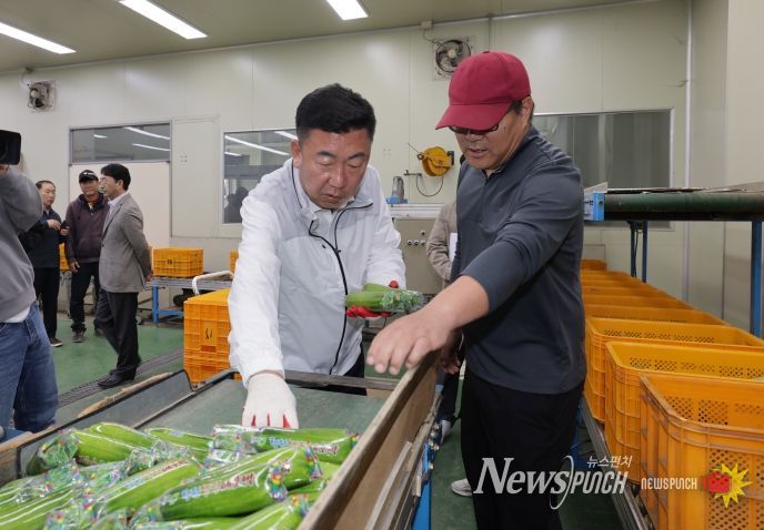 뉴스펀치 이현승 기자 | 이범석 청주시장은 20일 흥덕구 오송읍에 위치한 청원생명 애호박 공동선별장을 방문해 공선 및 유통 현황을 점검하고 관계자와 지역 농민들을 격려했다.