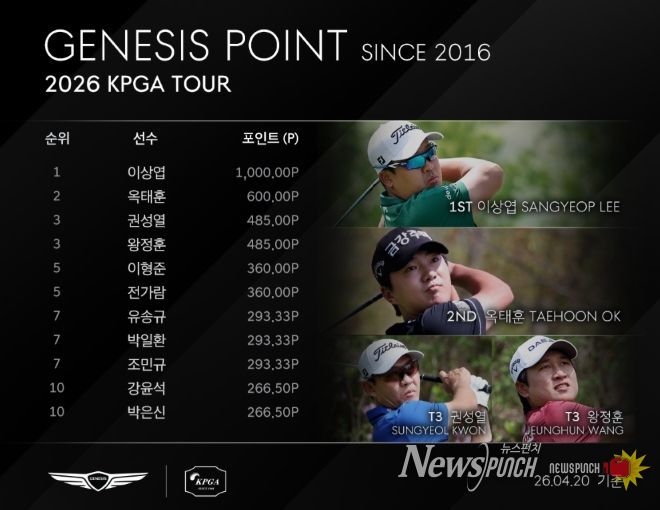 권성열(40)과 왕정훈(31.DAEJIN)이 485포인트로 제네시스 포인트 3위, 이형준(34.웰컴저축은행), 전가람(31.LS)이 360포인트로 제네시스 포인트 5위에 이름을 올렸다.
