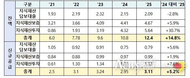 지식재산 금융 잔액은 ’24년 말 10.8조원에서 ’25년 말 12.4조원으로 증가하여 전년대비 14.8% 성장했다. 2025년 지식재산 금융 신규공급은 총 3.1조원으로, 2024년 2.95조원 대비 5.2% 증가했다.