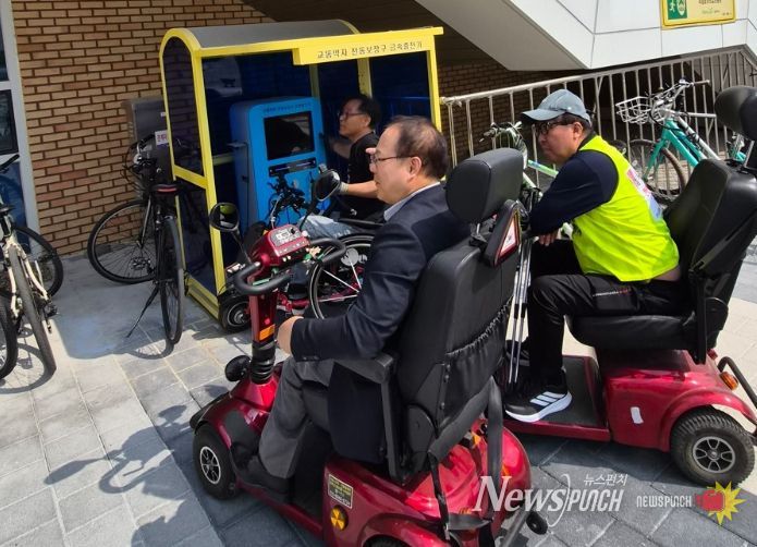 이번 현장점검은 디딤돌장애인자립생활센터(센터장 이우연)의 제안으로 마련됐으며, 공원 내 설치된 전동스쿠터 급속충전기의 실제 이용 과정과 관리 상태를 확인하기 위해 진행됐다.