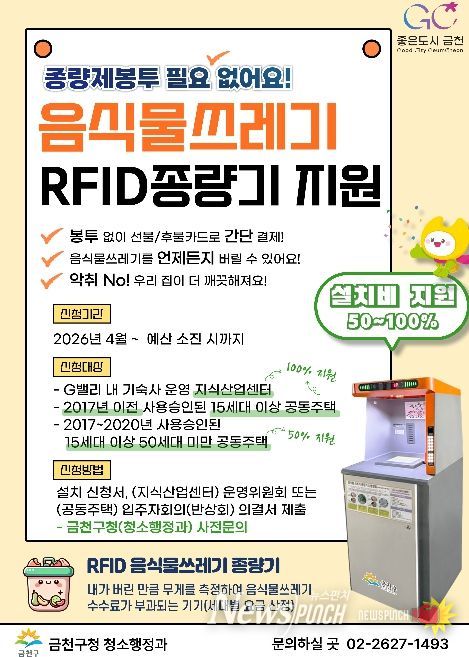 뉴스펀치 박상훈 기자 | 금천구는 생활폐기물 직매립이 금지됨에 따라 음식물쓰레기 혼합배출을 예방하고 배출량을 줄이기 위해 2026년 음식물쓰레기 자동계량장비(RFID) 종량기 설치 지원을 신청받는다고 밝혔다.