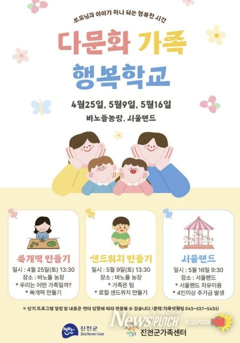 뉴스펀치 이현승 기자 | 충북 진천군가족센터는 진천군의 지원을 받아 다문화가족의 건강한 가족관계 형성과 정서적 유대 강화를 위한 ‘2026년 다문화가족 행복학교’를 운영한다고 밝혔다.