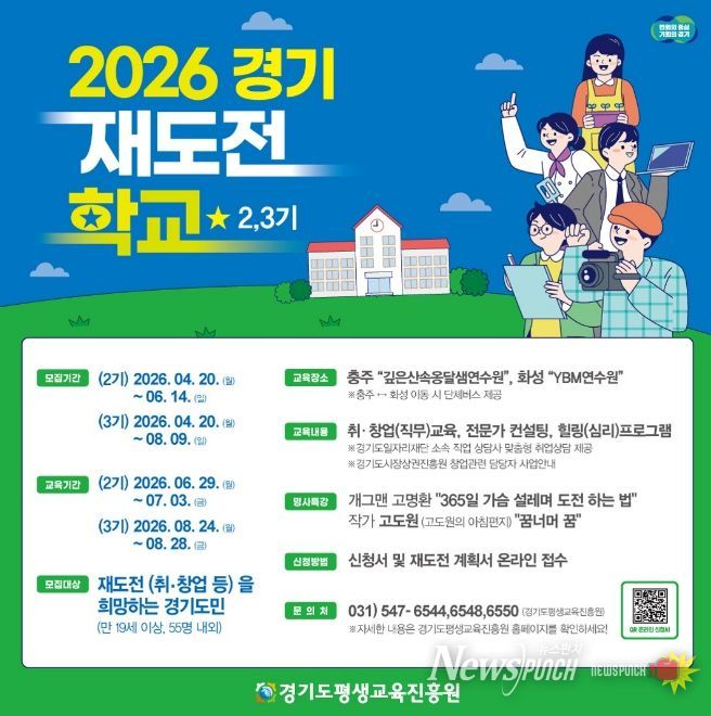 뉴스펀치 박상훈 기자 | 경기도와 경기도평생교육진흥원은 취업이나 창업 실패를 경험한 도민의 재기를 지원하기 위해 오는 20일부터 ‘2026년 경기 재도전학교’ 2~3기 참가자를 각각 55명 내외로 모집한다.