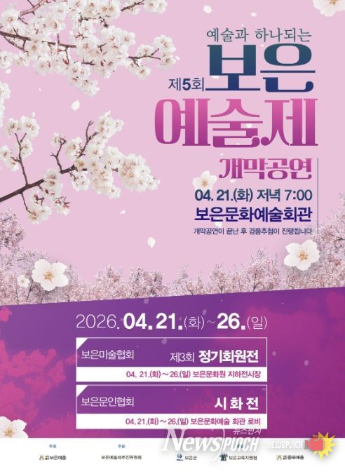 뉴스펀치 이현승 기자 | 충북 보은군은 지역 예술인과 군민이 문화로 소통하고 화합하는 ‘제5회 보은예술제’를 21일부터 26일까지 6일간 보은문화예술회관 및 보은문화원 일원에서 개최한다고 밝혔다.