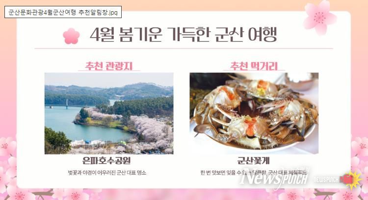 뉴스펀치 정홍균 기자 | 군산시는 계절과 시기에 맞는 관광 정보를 한눈에 제공하는 ‘월별 추천 콘텐츠 알림창 서비스’를 오는 5월부터 본격 운영한다고 밝혔다.