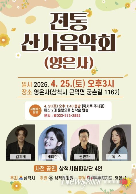 뉴스펀치 조평훈 기자 | 삼척시는 4월 25일 근덕면 영은사에서 자연과 전통이 어우러진 '전통 산사 숲속 음악회'를 개최한다고 밝혔다.