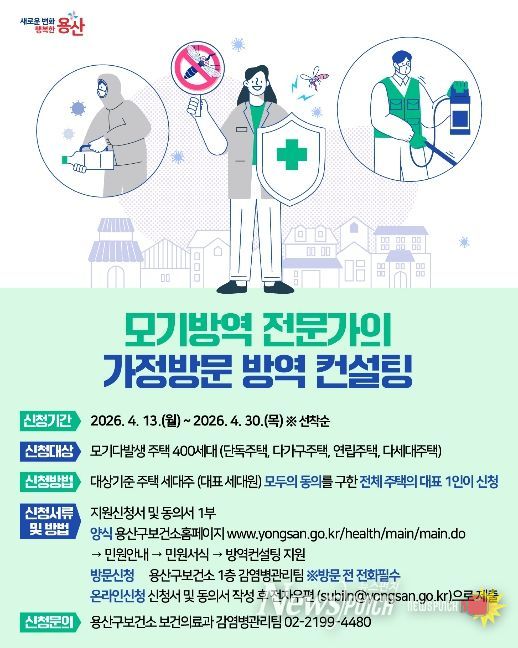 뉴스펀치 박상훈 기자 | 서울 용산구가 다가오는 여름철 모기 매개 감염병 예방과 주민들의 쾌적한 주거 환경 조성을 위해 ‘모기방역 전문가 가정방문 컨설팅’을 500가구로 대폭 확대 추진한다.