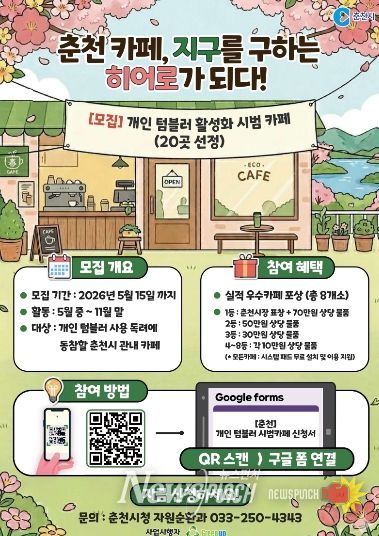 모집 기간은 5월 15일까지다. 선정된 카페는 5월 중순부터 11월 말까지 약 6개월간 시범사업에 참여하게 된다. 참여 대상은 개인 텀블러 사용 권장 등 친환경 실천에 동참할 의사가 있는 춘천시 지역 내 카페다.