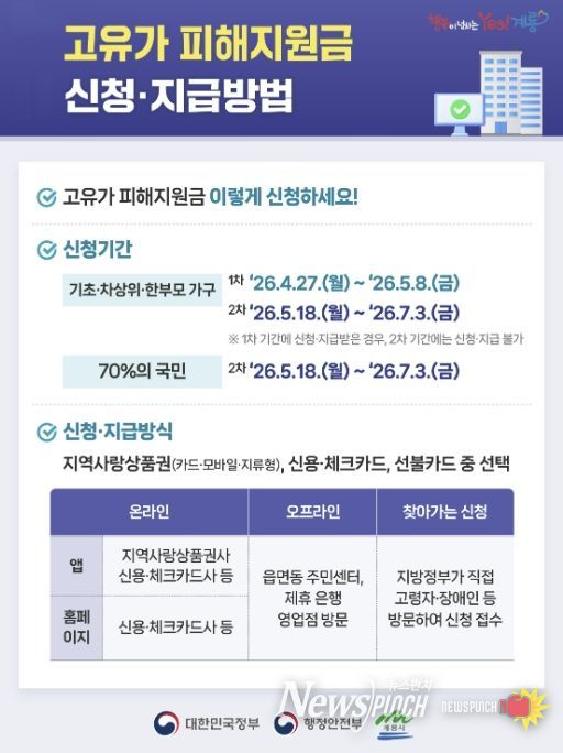 뉴스펀치 이현승 기자 | 충남 계룡시는 최근 중동지역 전쟁 등으로 인한 고유가·고물가 상황 속에서 시민들의 경제적 부담을 완화하기 위해 ‘고유가 피해지원금’ 지원사업을 본격 추진한다고 밝혔다.