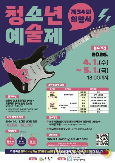 장원호 의왕시청소년예술제 담당자는 “청소년들이 주도적으로 참여하는 예술 활동을 통해 자신의 재능을 마음껏 펼칠 수 있는 기회가 되길 바란다”며 “관내 청소년들의 많은 관심과 참여를 기대한다”고 전했다.