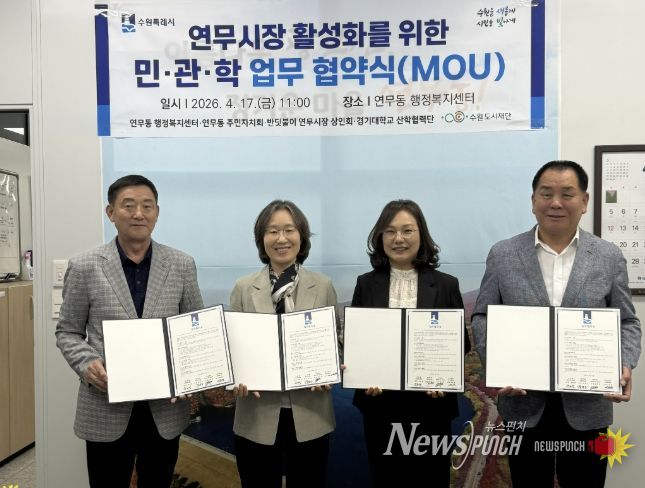 뉴스펀치 박상훈 기자 | 수원시 장안구 연무동 행정복지센터와 주민자치회, 반딧불이연무시장상인회, 경기대학교 산학협력단은 지난 17일, 각 기관의 긴밀한 상호 협력과 유대관계 강화를 위한 업무협약을 체결했다.