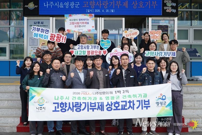 뉴스펀치 김용희 기자 | 전남 나주시 건축허가과(과장 김훈모)와 영광군 건축허가과(과장 윤상근)는 고향사랑기부제의 정착과 지역의 상생발전을 위해 지난 20일 나주시청에서 상호 교차 기부를 실시했다고 밝혔다.