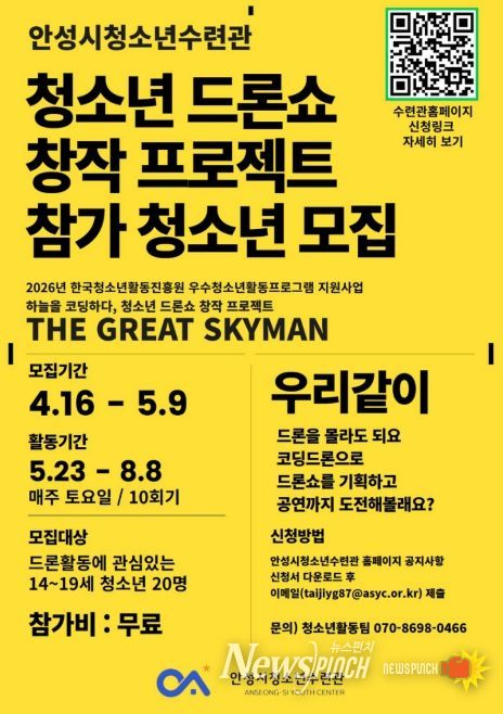 뉴스펀치 박상훈 기자 | 안성시청소년수련관은 미래 디지털 인재 양성을 위한 청소년 참여형 프로그램 '하늘을 코딩하다, 청소년 드론쇼 창작 프로젝트 ‘THE GREAT SKYMAN’'에 참여할 청소년을 4월 16일 ~ 5월 8일까지 모집한다고 밝혔다.