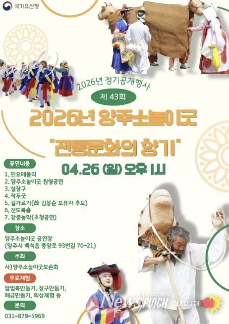 뉴스펀치 박상훈 기자 | 양주시는 국가유산청의 지원을 받아 ‘제43회 양주소놀이굿 정기공개행사’를 오는 26일 오후 1시, 양주소놀이굿 전수교육관 공연장에서 개최한다고 밝혔다.