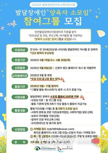 뉴스펀치 정홍균 기자 | 인천시사회서비스원 소속 인천장애인종합복지관은 ‘발달장애인 양육자 소모임’ 참여자를 모집한다고 21일 밝혔다.