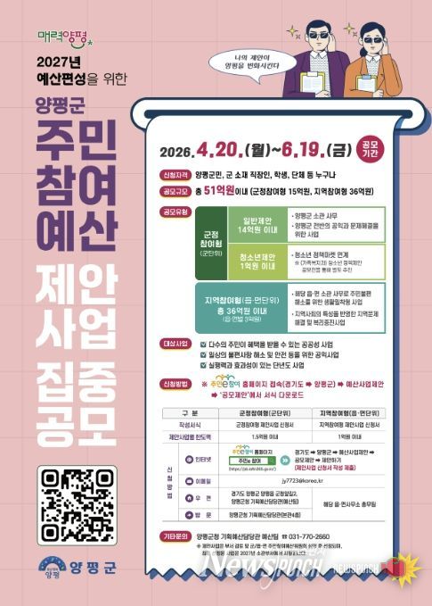 뉴스펀치 박상훈 기자 | 양평군은 오는 6월 19일까지 2027년 예산에 반영할 ‘주민참여예산 제안사업’을 집중 공모한다고 밝혔다.