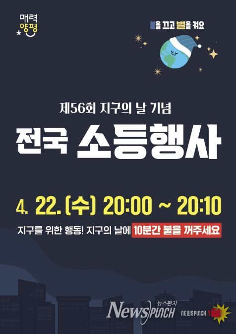 특히 지구의 날 당일인 22일 오후 8시부터 10분간 전 군민이 참여하는 ‘소등 행사’가 진행된다. 양평군청을 비롯한 관내 공공기관은 전면 소등에 참여하고, 공동주택과 일반 가정에서도 자율적으로 동참할 수 있도록 할 계획이다.