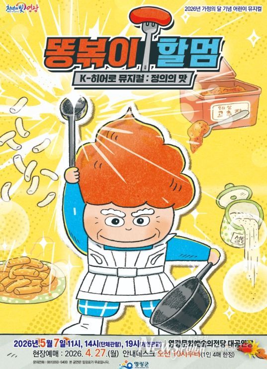 뉴스펀치 김용희 기자 | 영광군은 오는 5월 7일 오전 11시(단체관람), 오후 2시(단체관람), 7시에 영광문화예술의전당 대공연장에서 가정의 달 특집공연 웃음과 감동, 그리고 건강한 메시지를 전하는 이야기 ‘어린이뮤지컬 똥볶이 할멈’을 공연한다.