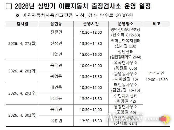 뉴스펀치 김용희 기자 | 광양시는 이륜자동차 정기검사의 원활한 추진과 검사소가 없는 지역 주민의 편의를 위해 4월 27일부터 30일까지 한국교통안전공단과 합동으로 2026년 상반기 이륜자동차 출장검사소를 운영한다고 밝혔다.