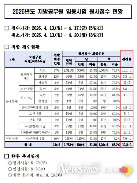 뉴스펀치 김윤걸 기자 | 부산광역시교육청은 지난 13일부터 17일까지 실시한 ‘2026년도 지방공무원 임용시험’ 원서접수 결과 144명 선발에 1,753명이 지원해 평균 12.2대 1의 경쟁률을 보였다고 밝혔다.