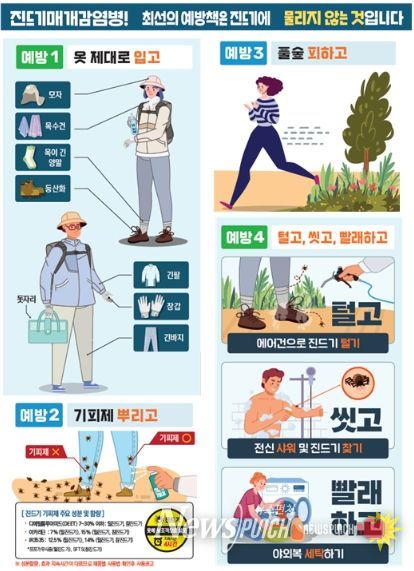 진드기 매개 감염병을 예방하기 위해서는 야외활동 시, 긴 옷과 팔토시, 장화 등을 착용해 피부 노출을 최소화하고, 작업 중 3~4시간마다 기피제를 뿌려야 한다. 특히, 풀밭에 앉거나 눕지 않고, 귀가 즉시 옷을 세탁하고 목욕을 하는 등 예방수칙을 준수하는 것이 중요하다.